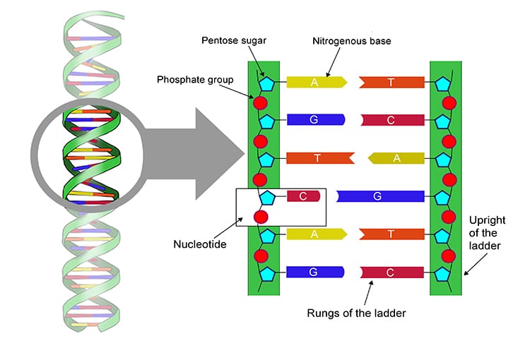 DNA contains the code for building and maintaining an organism. The code is spelled out in the order, or sequence, of four chemical bases—adenine (A), guanine (G), thymine (T) and cytosine (C). DNA bases pair with each other—adenine (A) with thymine (T), guanine (G) with cytosine (C) —to form units called base pairs. Each base is attached to a sugar molecule and a phosphate molecule. Together, base, sugar, and phosphate are called a nucleotide. Nucleotides are arranged in two long strands that form a spiral called a double helix.